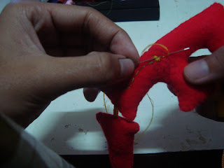 Jahit huruf-huruf yang telah dibentuk tersebut pada tali kur, jahit bersama dengan tali kur agar jahitan lebih kuat dan isi dengan dakron. Pertama jahit telebih dahulu huruf F, lalu I, kemudian B